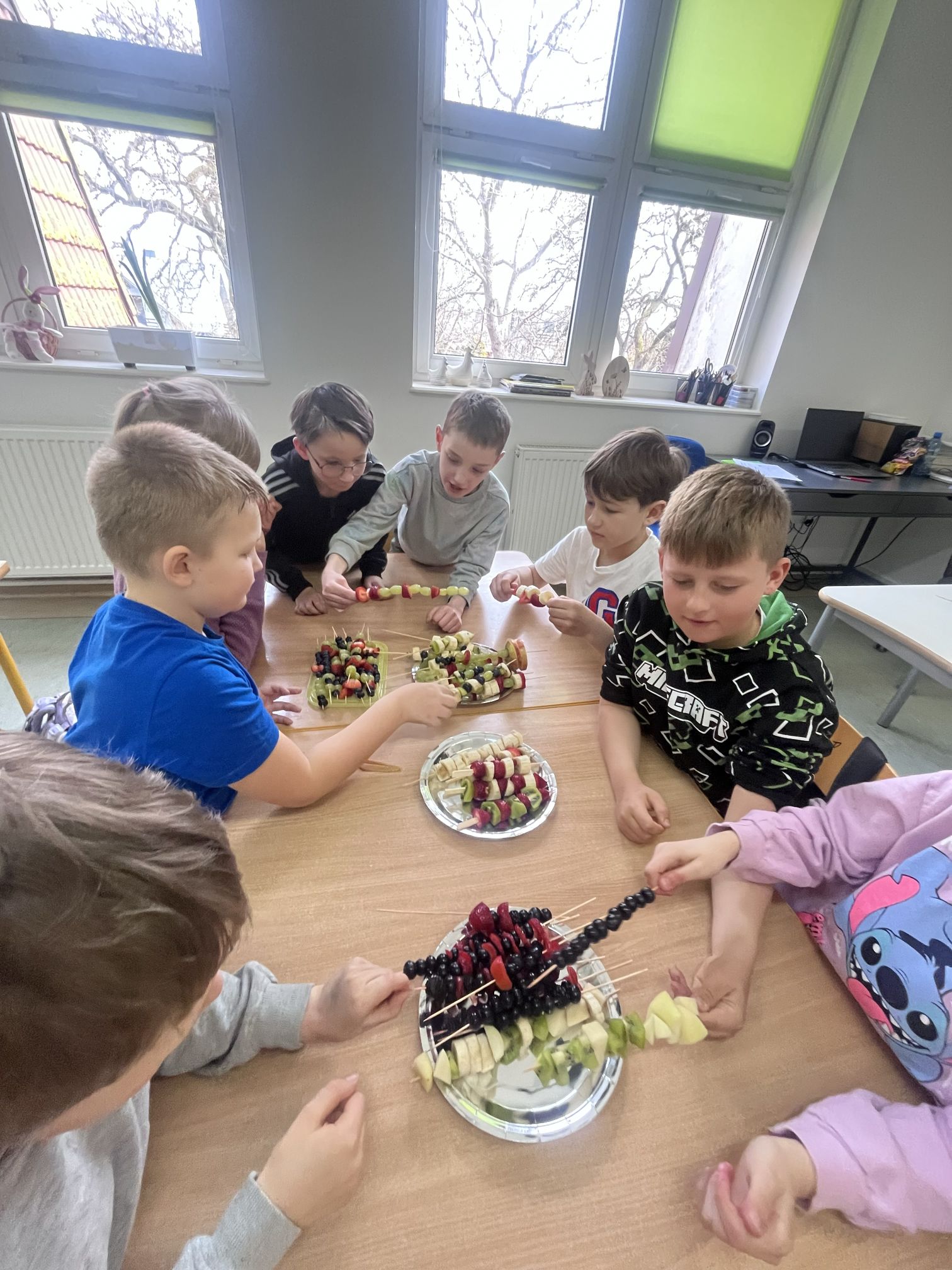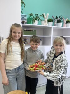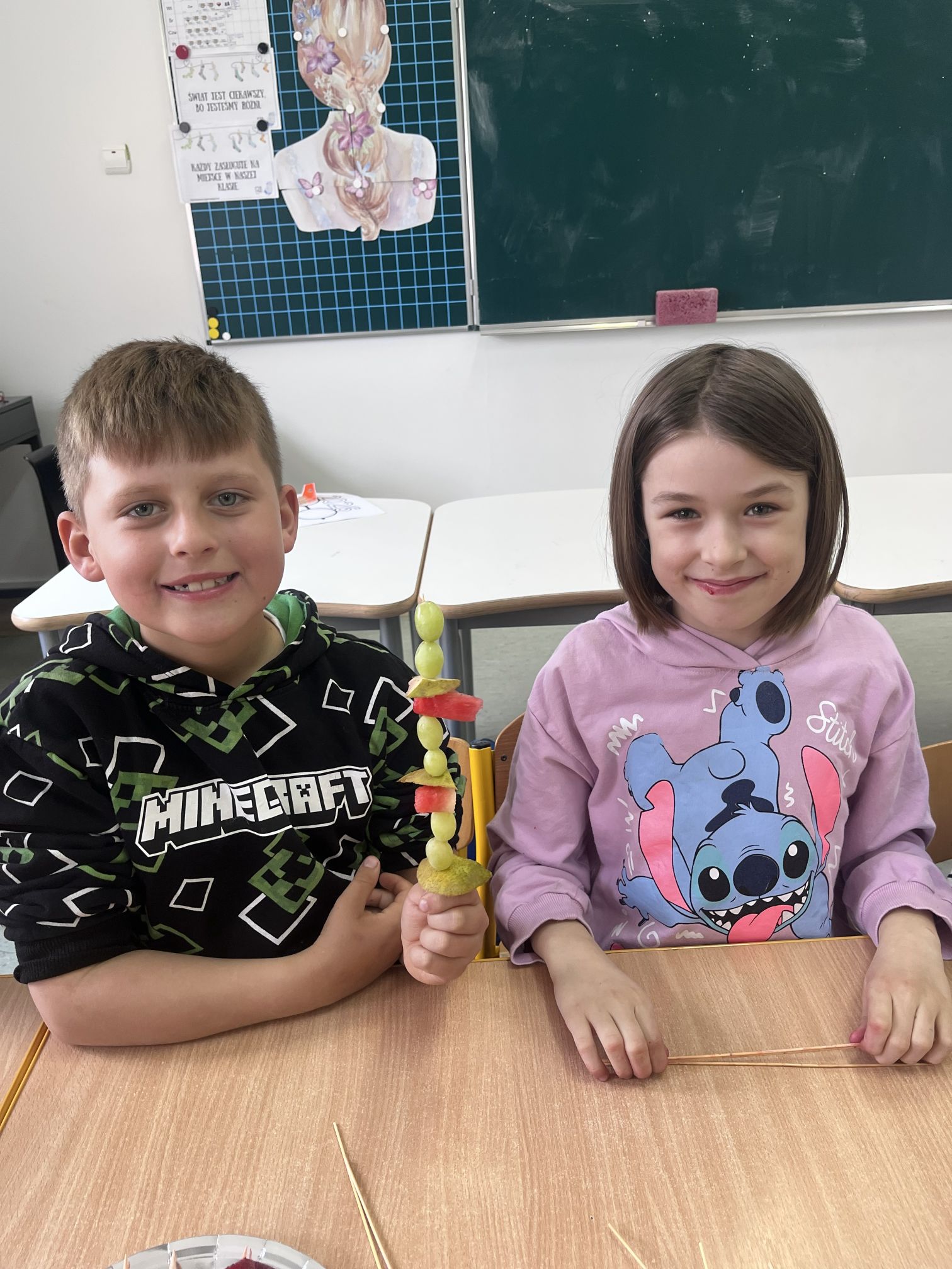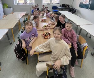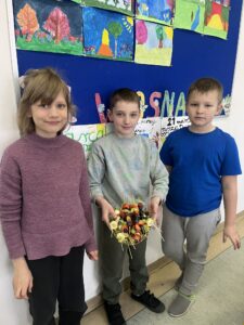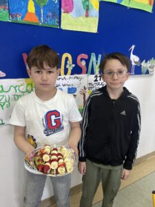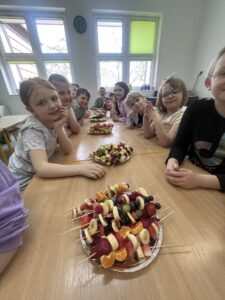 Uczniowie klasy drugiej z radością i zaangażowaniem przystąpili do przygotowania kolorowych szaszłyków owocowych. Była to nie tylko świetna zabawa, ale także okazja do nauki zdrowych nawyków żywieniowych oraz rozwijania samodzielności. Na zakończenie wszyscy z apetytem degustowali przygotowane szaszłyki, przekonując się, że zdrowe przekąski smakują wyśmienicie.