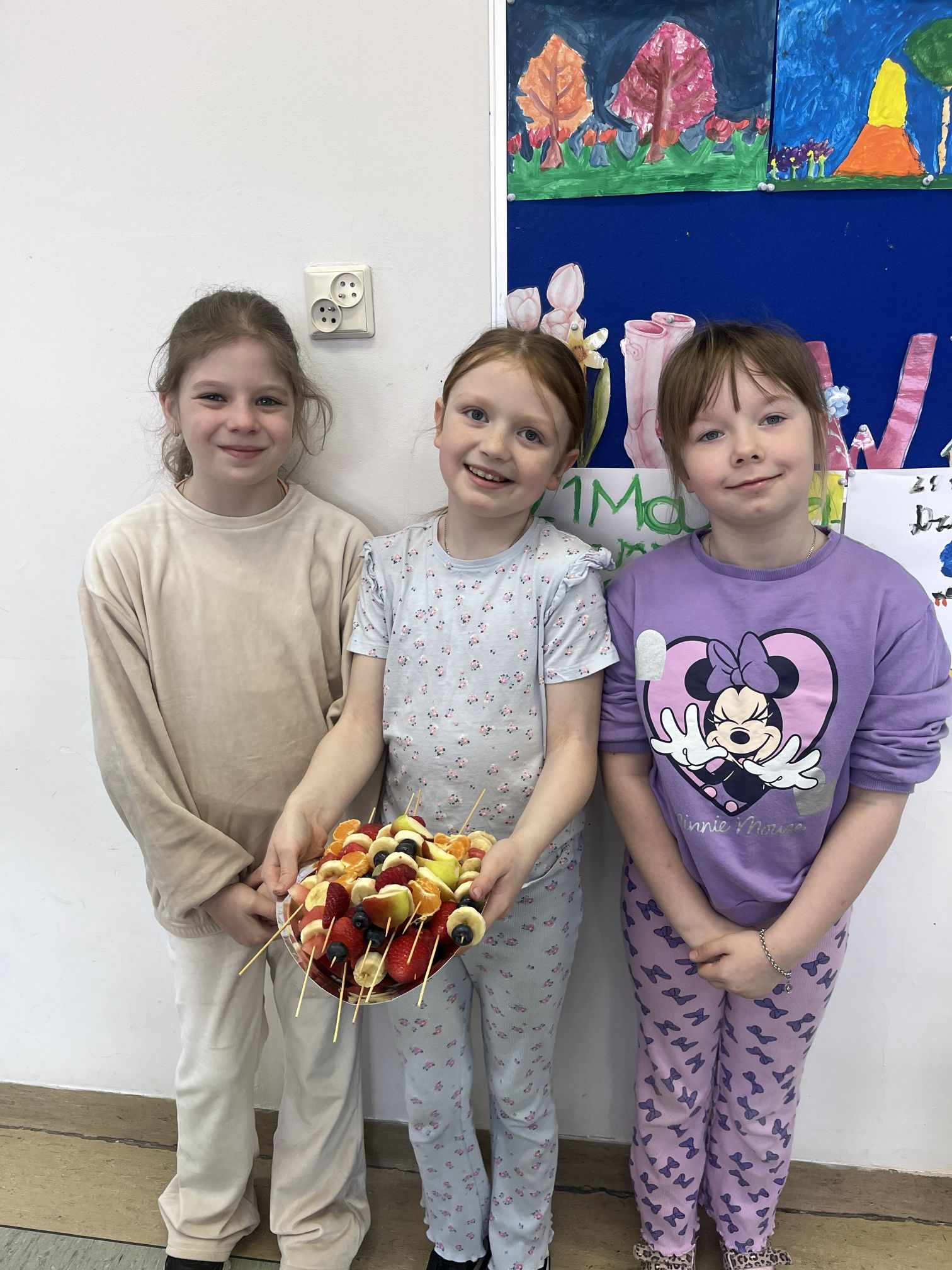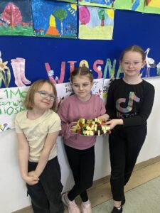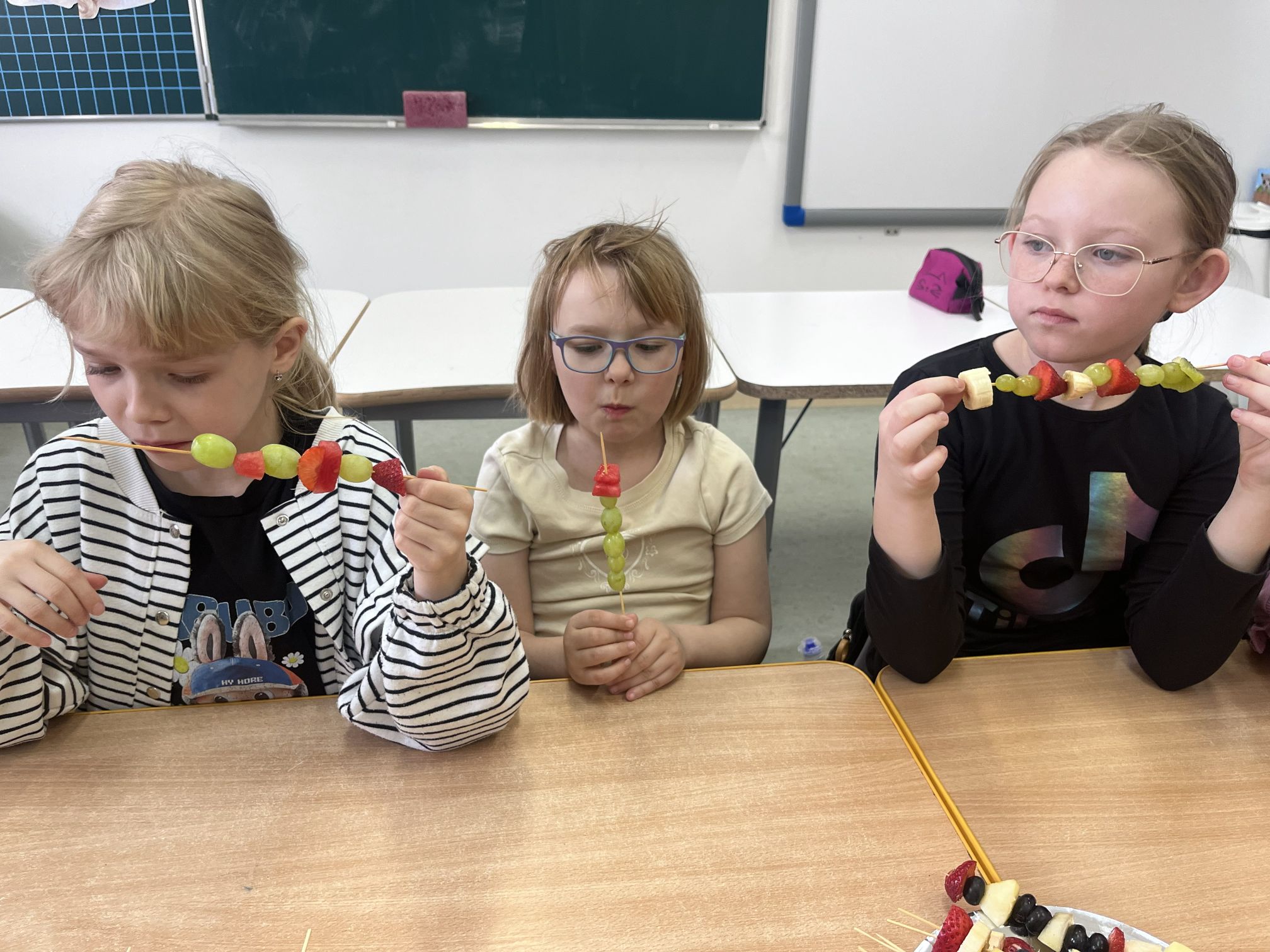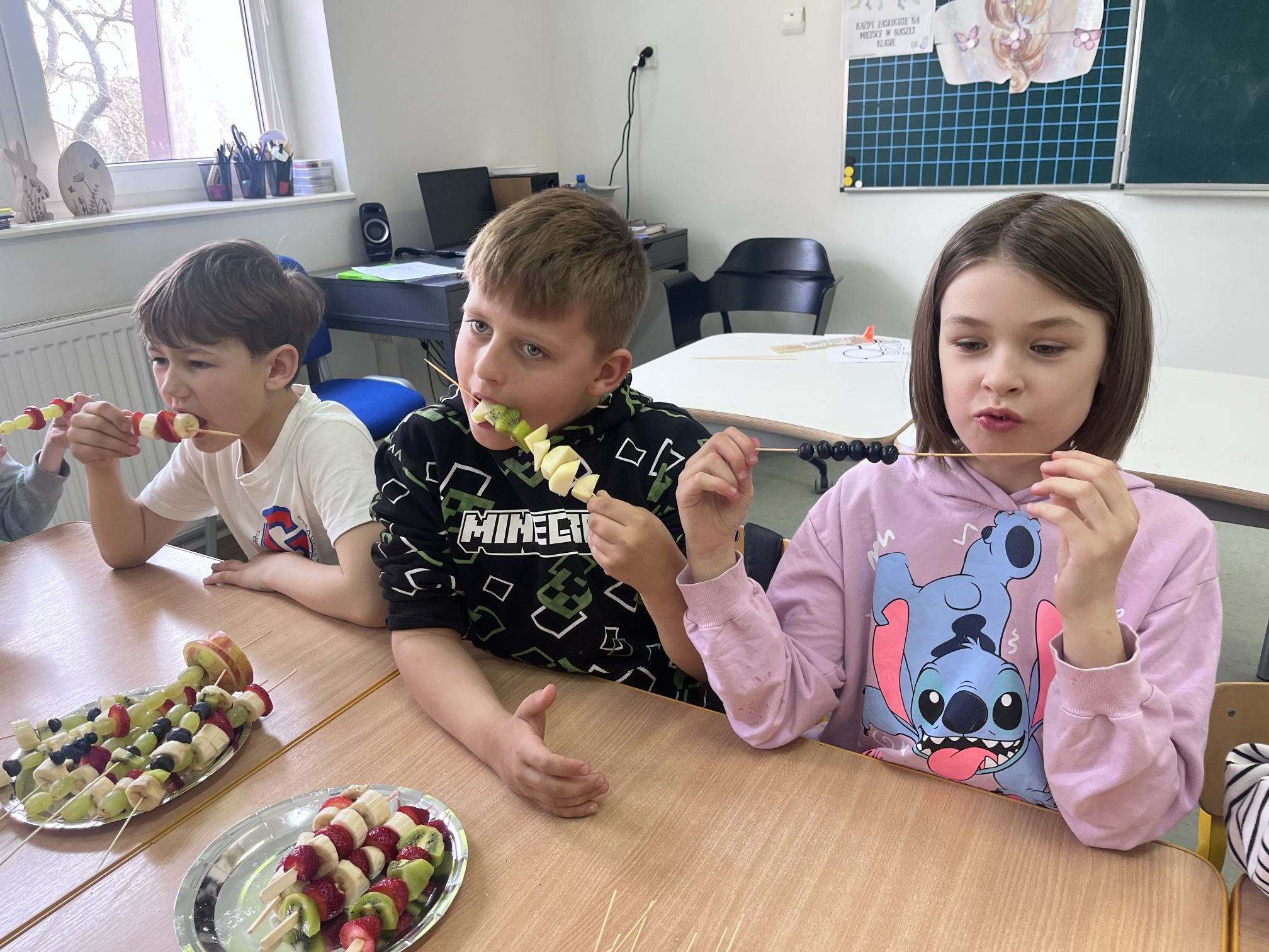 Uczniowie klasy drugiej z radością i zaangażowaniem przystąpili do przygotowania kolorowych szaszłyków owocowych. Była to nie tylko świetna zabawa, ale także okazja do nauki zdrowych nawyków żywieniowych oraz rozwijania samodzielności. Na zakończenie wszyscy z apetytem degustowali przygotowane szaszłyki, przekonując się, że zdrowe przekąski smakują wyśmienicie.