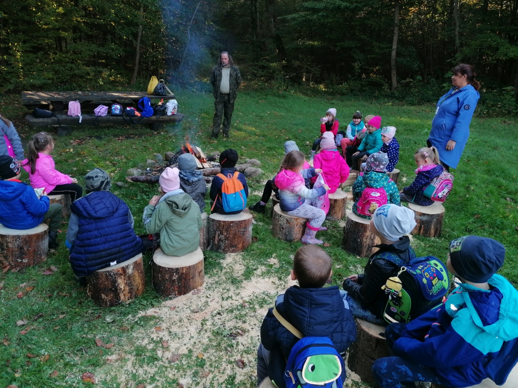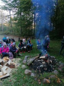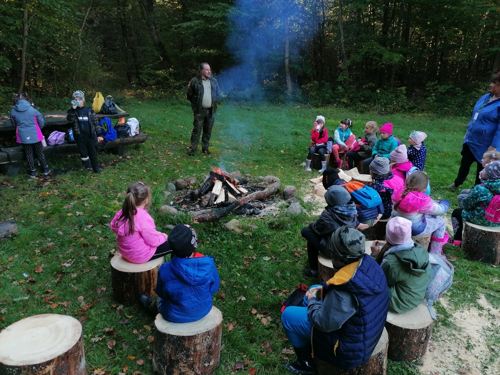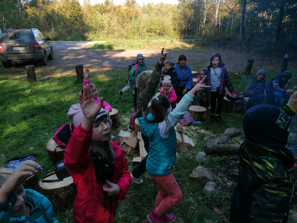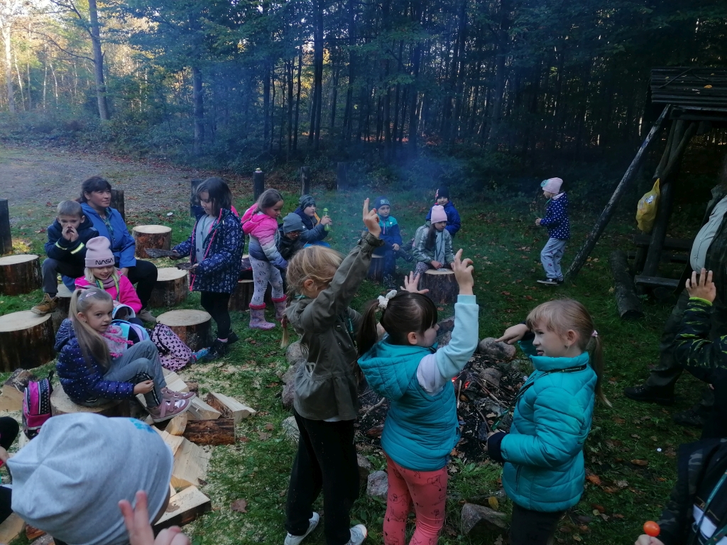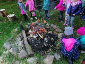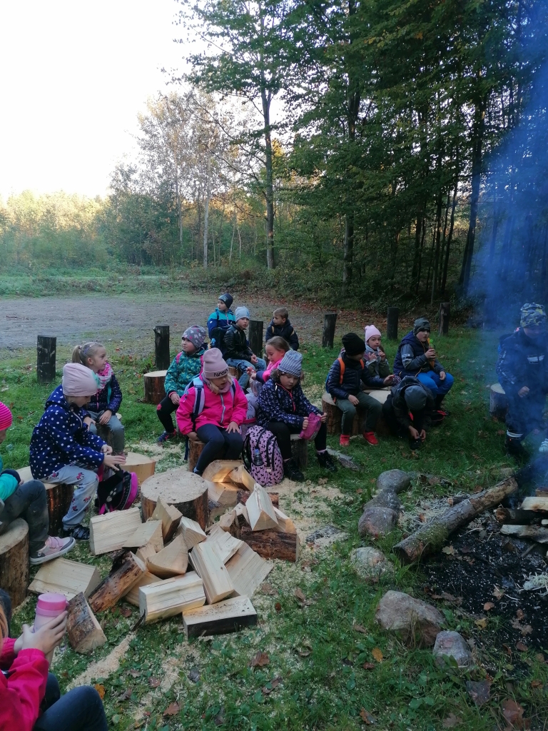 Pod opieką pana leśniczego Tomasza Turulskiego dzieci przeżyły wspaniałą lekcję przyrody na świeżym powietrzu. W ramach spotkania pan leśniczy przygotował ognisko, a dzieci samodzielnie przygotowały patyki, aby przy ognisku upiec kiełbaski. Z wielkim apetytem skonsumowały samodzielnie przygotowany posiłek i pełni siły i energii powróciły do szkoły.