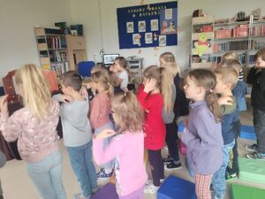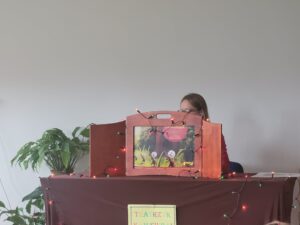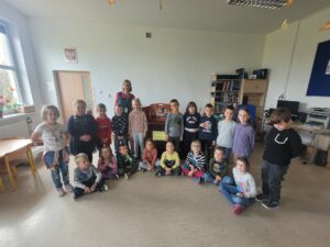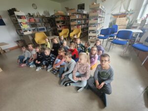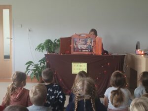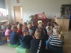 Korzystając z zaproszenia Pani Katarzyny Radaszewskiej, wybraliśmy się do biblioteki, aby uczestniczyć w teatrzyku Kamishibai. Dzieci wysłuchały bajki Braci Grimm pt. „Królowa pszczół”, a następnie wzięły udział w quizie dotyczącym wysłuchanych treści.