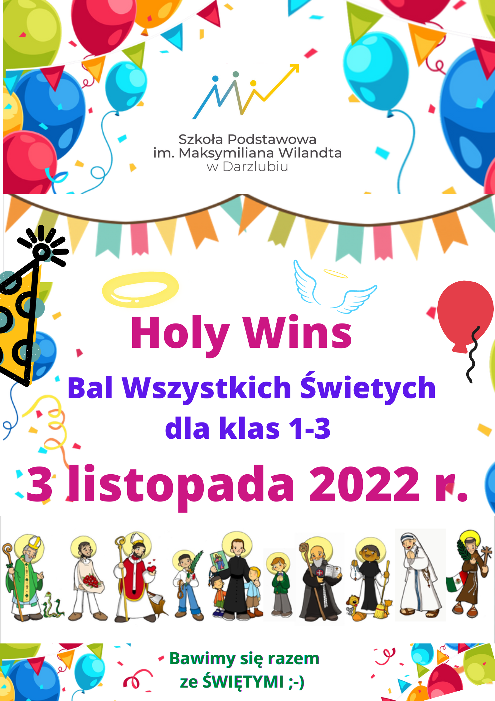 W dniu 3 listopada uczniowie klas 1-3 naszej szkoły wzięli udział „Holy Wins” czyli w Balu Wszystkich Świętych. Celem tej inicjatywy jest wprowadzanie dzieci w atmosferę radości i uświadomienie istoty listopadowego wspomnienia Wszystkich Świętych. Dzięki takim wydarzeniom uczniowie mogą lepiej poznać świętych patronów oraz ich życie.