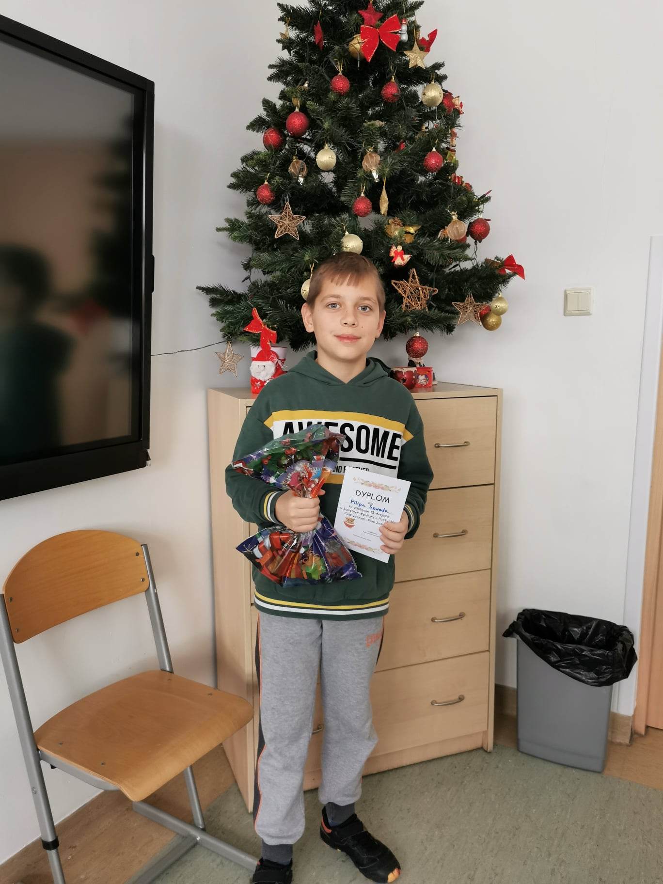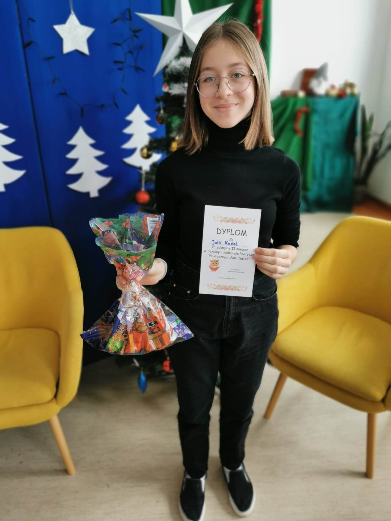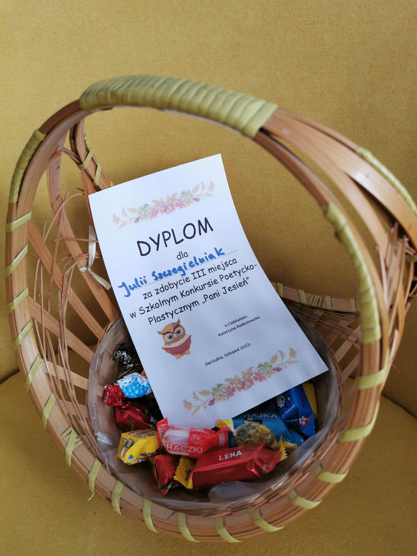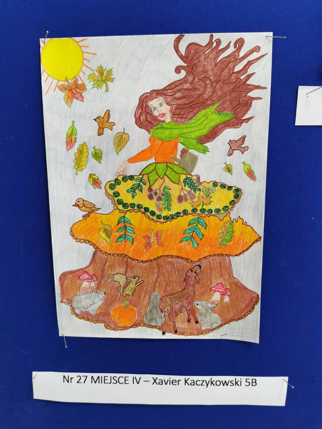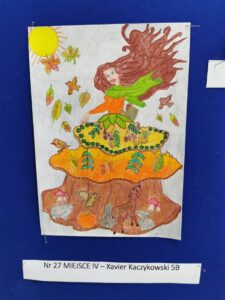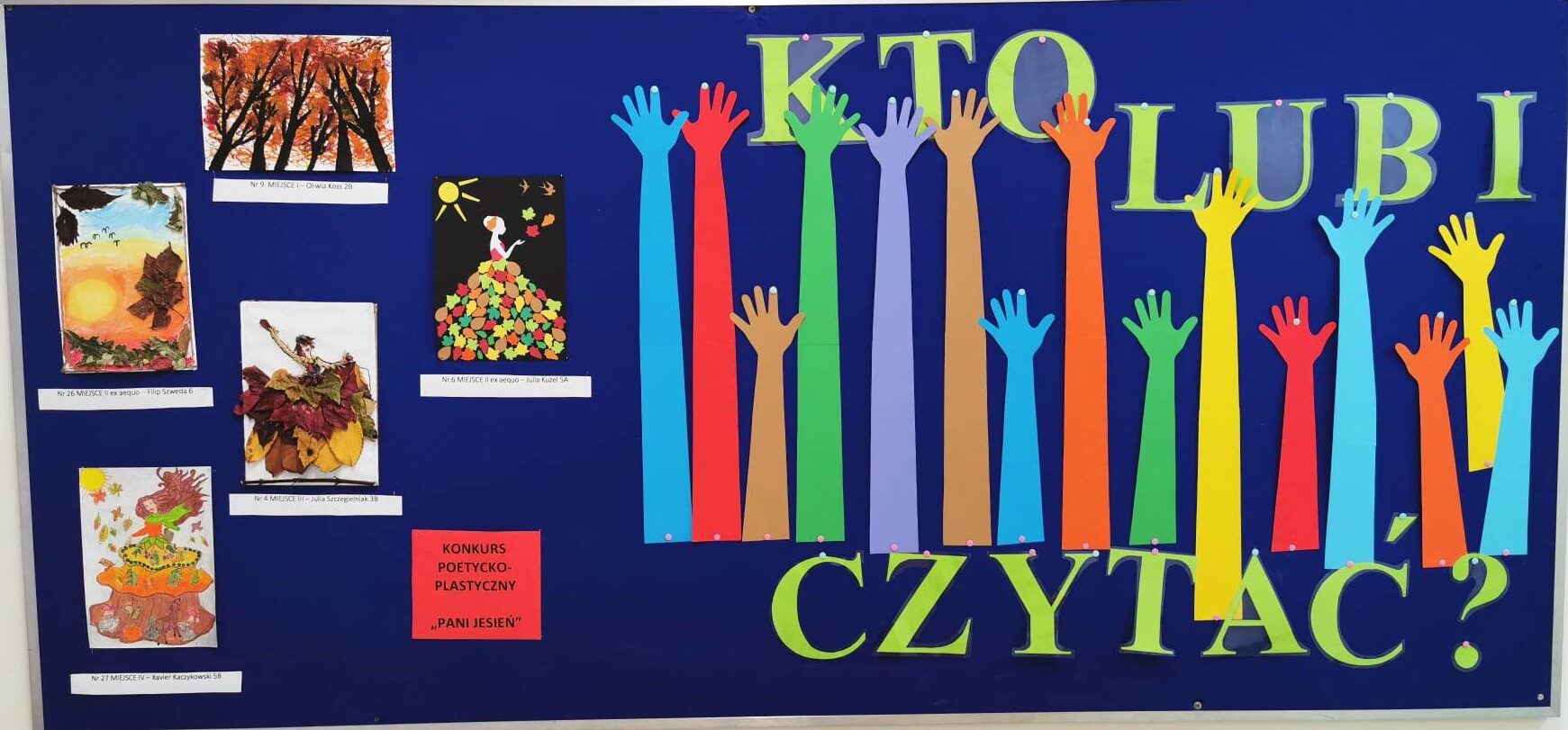Biblioteka szkolna zaprosiła uczniów do udziału w konkursie poetycko-plastycznym, który polegał na wykonaniu ilustracji do wiersza pt.:„Pani jesień”. Wkrótce biblioteka zaczęła tonąć pośród pięknych prac wykonanych przez dzieci przy użyciu różnorodnych technik plastycznych. Wszystkie prace zasłużyły na wyróżnienie, dlatego wszystkie zostały umieszczone na gazetce biblioteki. Metodą głosowania zostali wyłonieni zwycięzcy. Wszystkim laureatom gratuluję, a uczestnikom gratuluję serdecznie i dziękuję za udział!