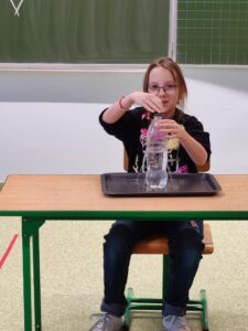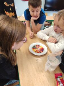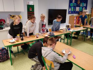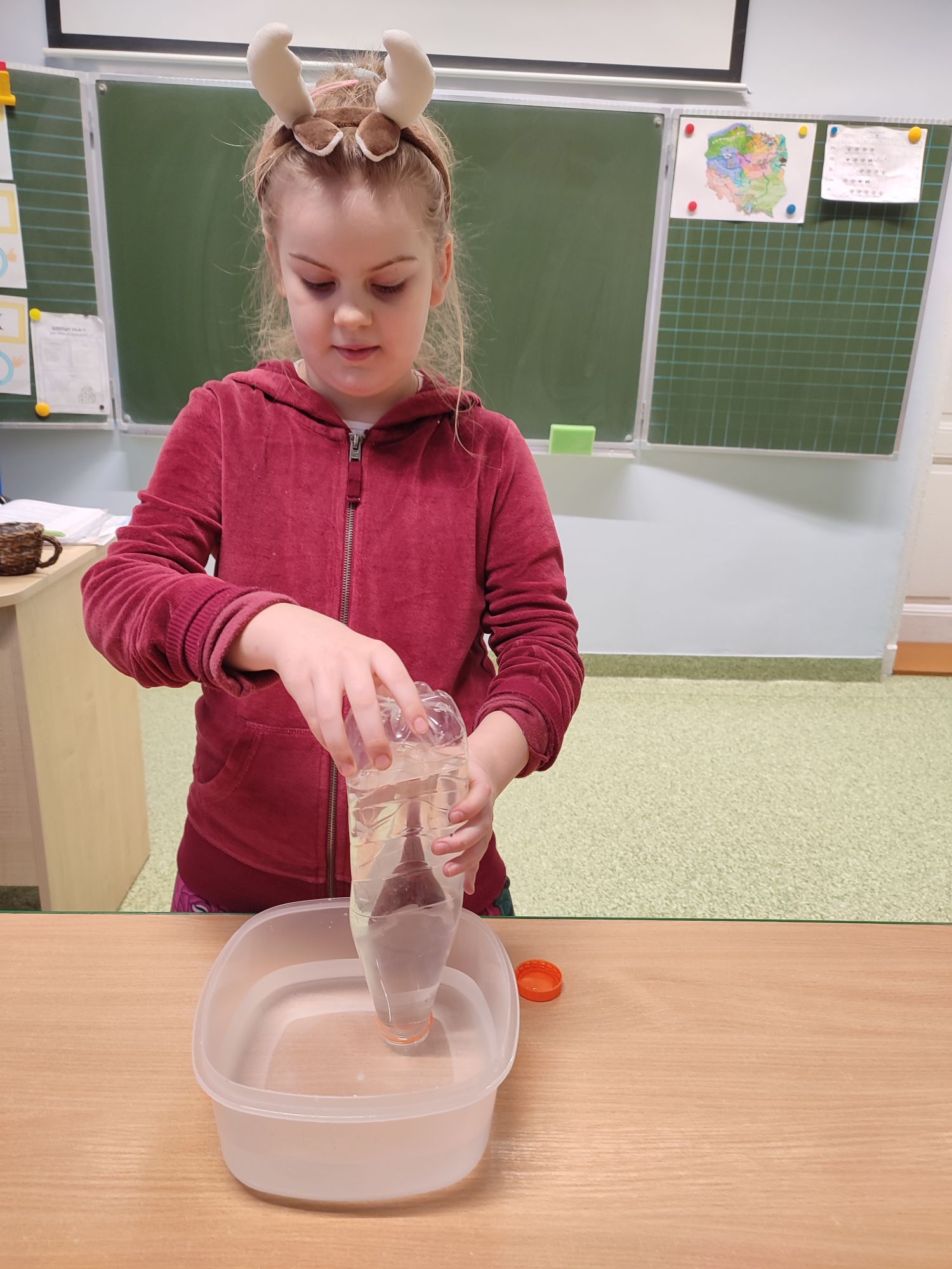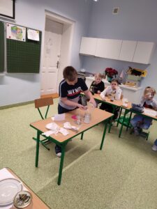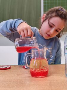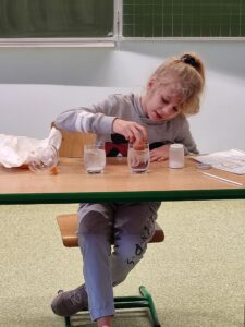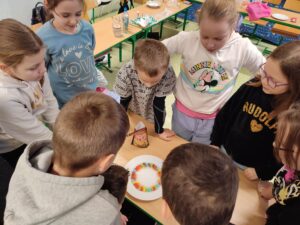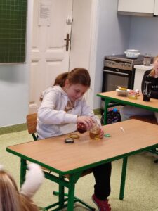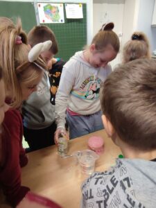 W klasie III b odbyła się lekcja pełna doświadczeń, eksperymentów. W tym dniu uczniowie przygotowali i samodzielnie przeprowadzili mnóstwo doświadczeń z wodą. Stawiali hipotezy i sprawdzali ich prawdziwość.Postawienie uczniów w roli badacza, eksperymentatora okazało się wspaniałą zabawą, dostarczającą wielu nowych doznań, wrażeń, emocji i radości, a jednocześnie sprawiło, że uczyli się odkrywając to, co nieznane, a zarazem fascynujące.