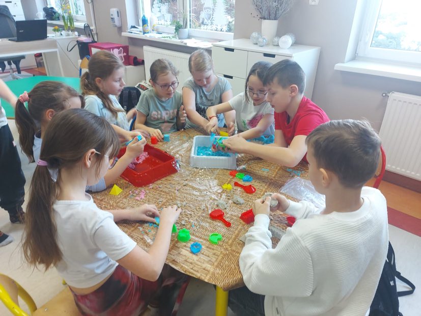 W świetlicy podczas zabawy dzieci poznawały właściwości piasku kinetycznego. Było to wspaniałe doświadczenie, które pobudza zmysły, rozwija zdolności manualne i wspiera kreatywność. Okazało się, że takie spędzanie czasu daje dzieciom dużo frajdy, przyjemności i radości.