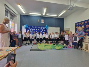 10 października miało miejsce wyjątkowe wydarzenie, pasowanie na przedszkolaka. Dzieci pięknie zaprezentowały swoje umiejętności, recytując, rapując i śpiewając. Przedszkolaki otrzymały dyplomy, które wręczył im Pan Dyrektor oraz upominki przygotowane przez rodziców.