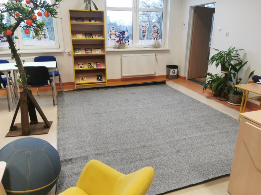 Z radością informujemy, że nasza Biblioteka wzbogaciła się o nowy, piękny dywan! Dzięki temu, zajęcia czytelnicze oraz biblioterapia będą mogły odbywać się w komfortowych warunkach. Zachęcamy do wspólnego spędzania czasu w przytulnej atmosferze, gdzie literatura ożywa na nowo.