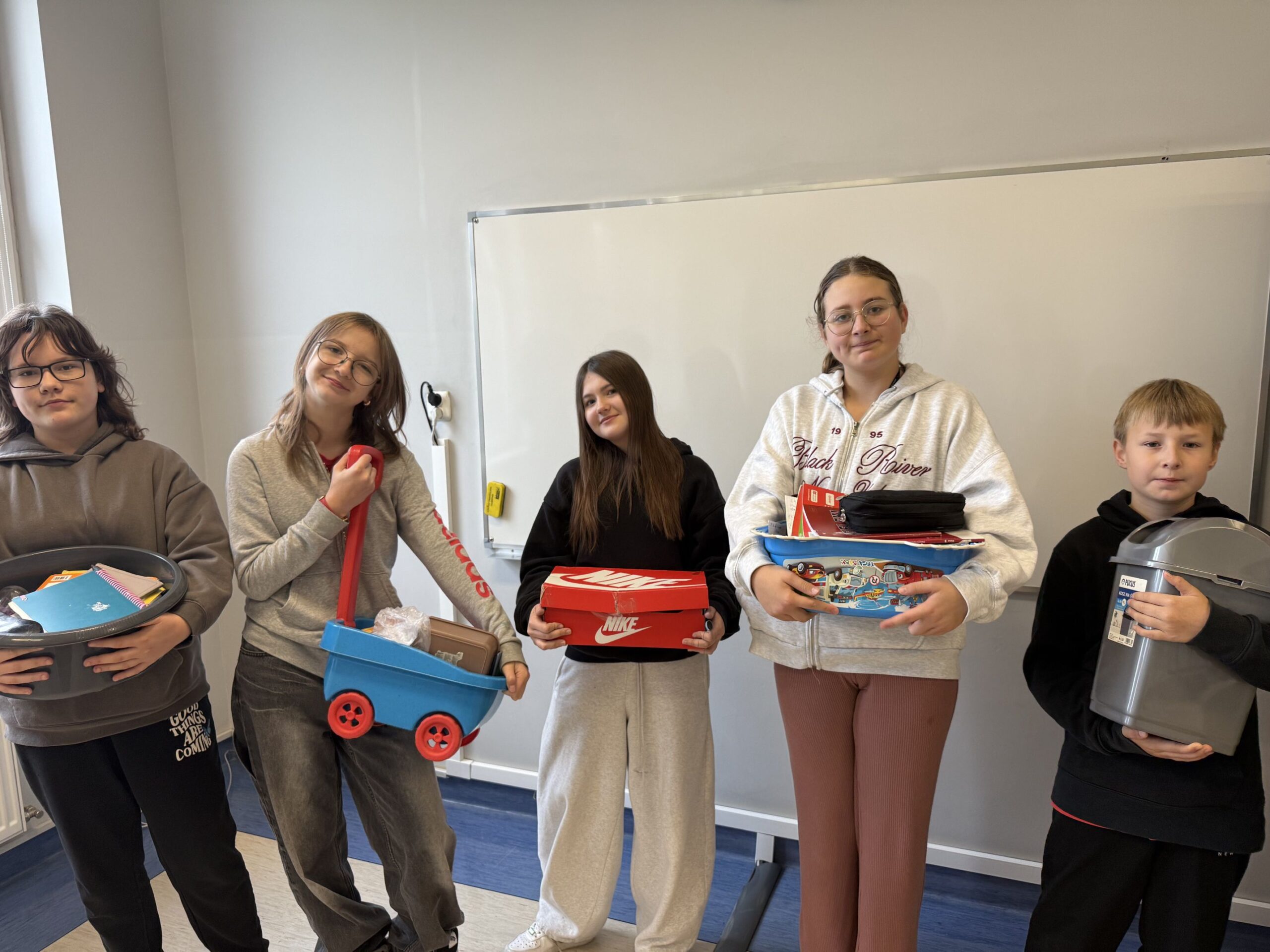 Z inicjatywy Samorządu Uczniowskiego w naszej szkole odbył się Dzień Bez Plecaka. Uczniowie zamiast tradycyjnych plecaków przynieśli książki w różnego rodzaju przedmiotach zastępczych – od koszyków i walizek, po pudełka i wózki!