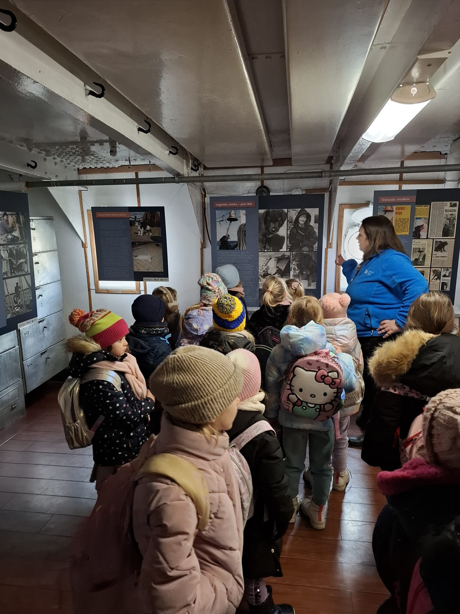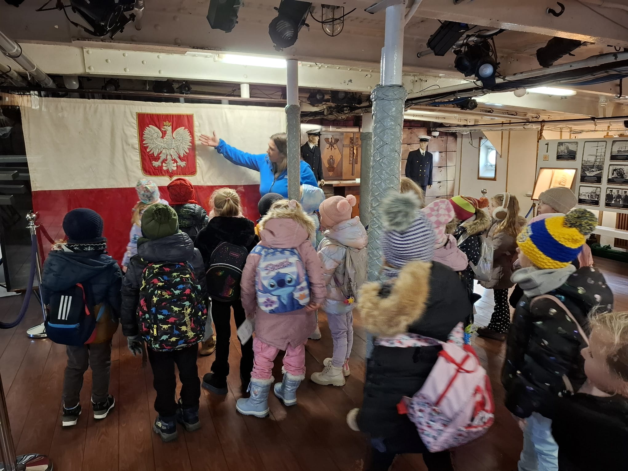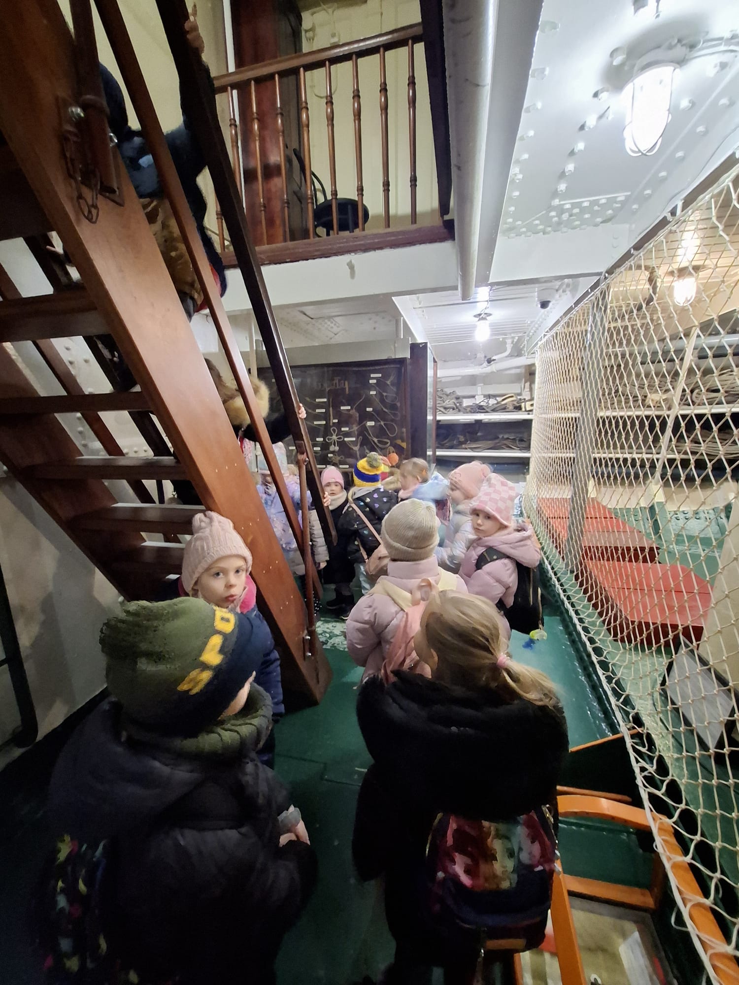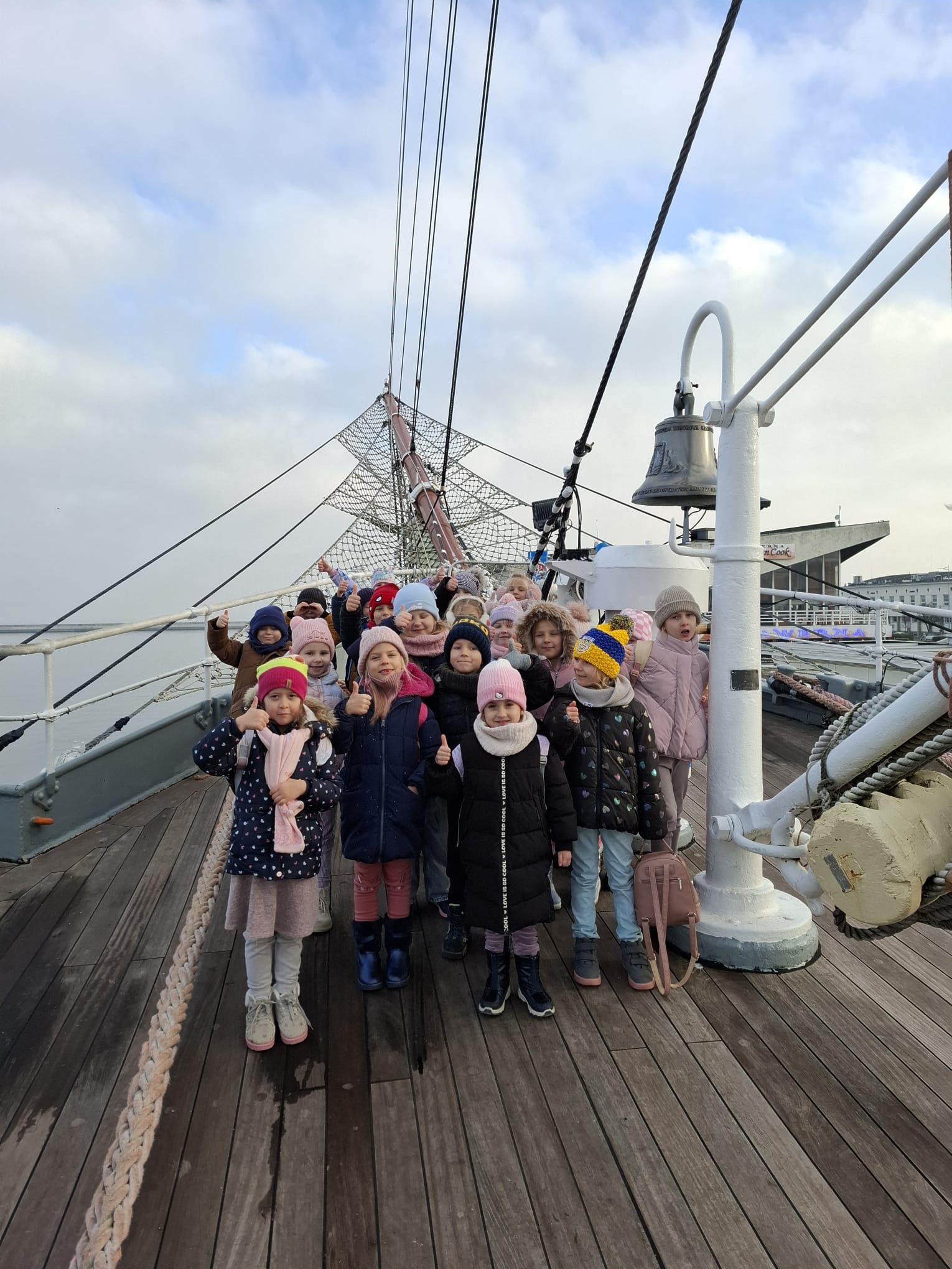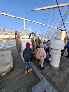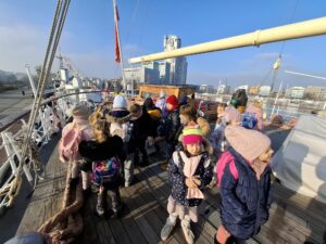 Kolejnym etapem wycieczki było zwiedzanie słynnego żaglowca Dar Pomorza. Przedszkolaki miały okazję wejść na pokład zabytkowego statku, zobaczyć dawne kajuty, pomieszczenia załogi oraz pokład główny. Wizyta na żaglowcu pozwoliła im poczuć klimat morskiej przygody i wyobrazić sobie życie dawnych mar sailorów.