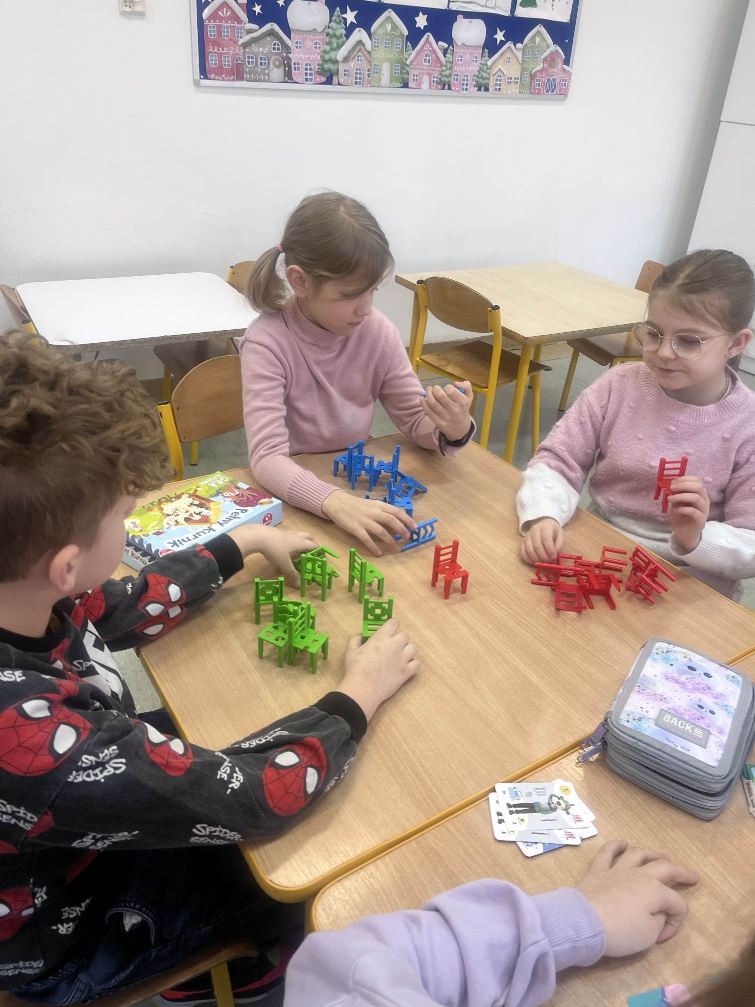 Podczas zajęć dzieci miały okazję grać w różnorodne gry dostosowane do ich wieku, które nie tylko sprawiły im dużo radości, ale także rozwijały ważne umiejętności: logiczne myślenie, koncentrację, współpracę w grupie oraz zdrową rywalizację. Uczniowie uczyli się zasad fair play, cierpliwości i komunikacji, a jednocześnie świetnie się bawili.