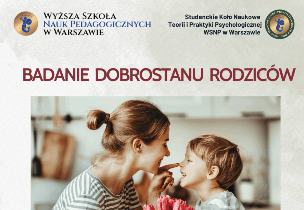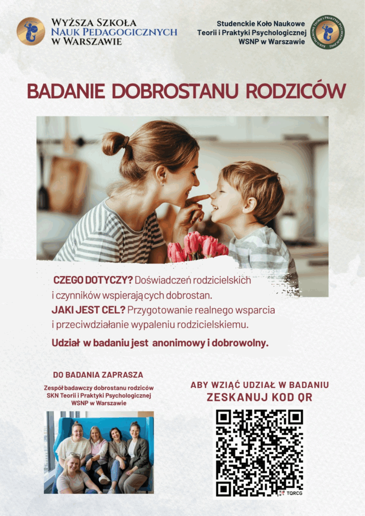 Przekazujemy informację o badaniu naukowym skierowanym do rodziców wychowujących dzieci do 18 roku życia. Badanie dotyczy doświadczeń rodzicielskich, czynników wspierających dobrostan oraz przeciwdziałania przeciążeniu i wypaleniu. Prowadzone jest w ramach działalności Studenckiego Koła Naukowego Teorii i Praktyki Psychologicznej Wyższej Szkoły Nauk Pedagogicznych w Warszawie pod kierunkiem dr Karoliny Mudło – Głagolskiej.